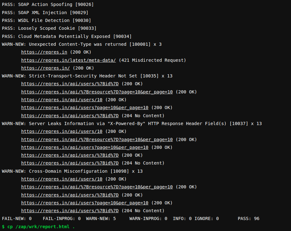 Видим результат проверки: 96 проверок пройдено, найдено 5 уязвимостей: